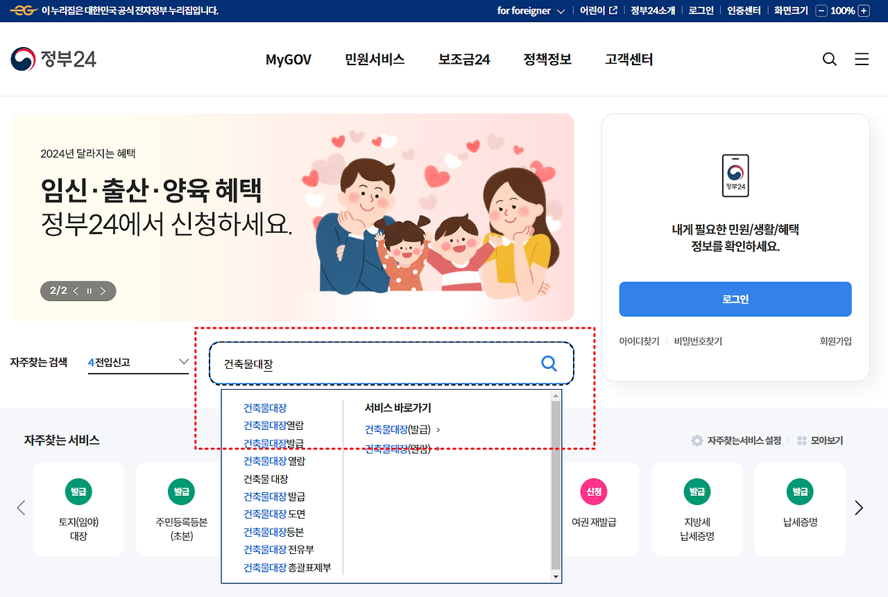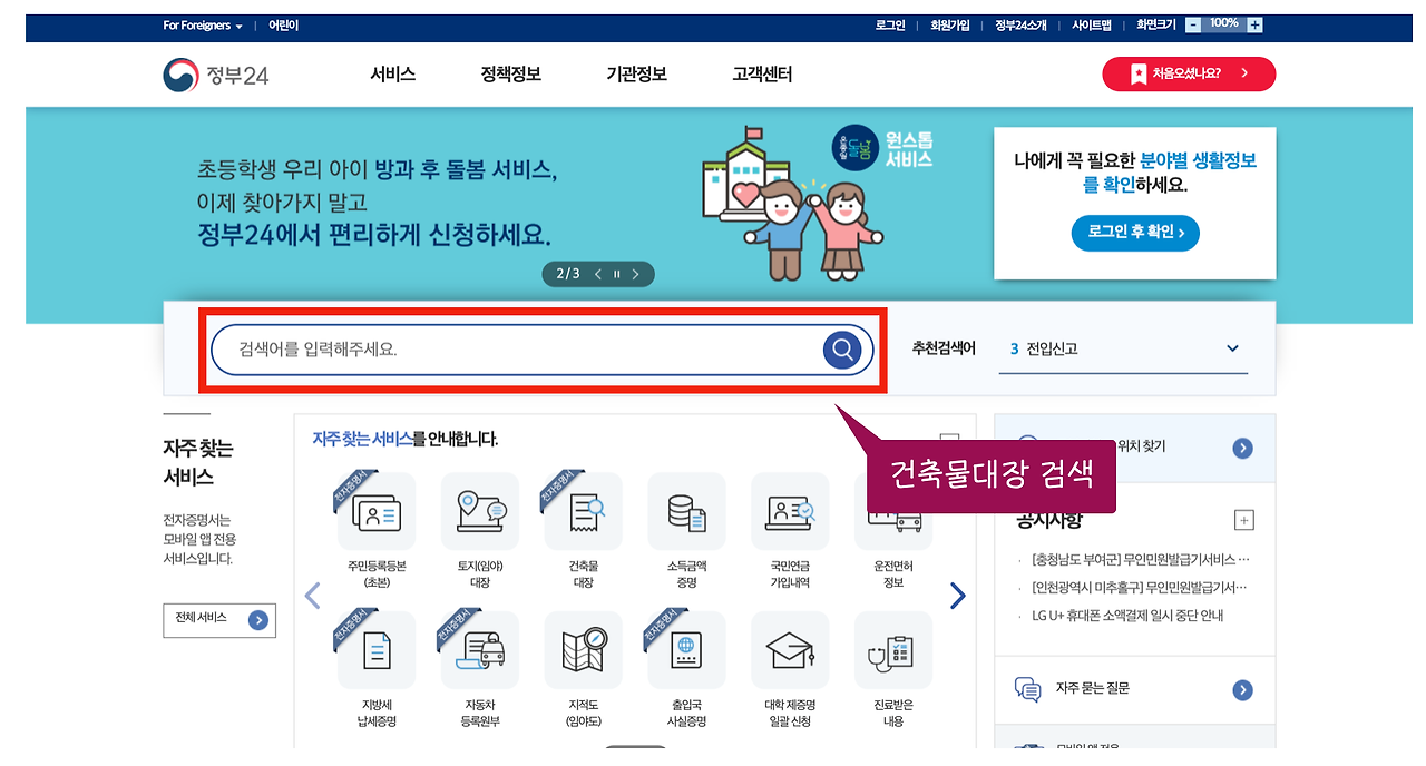 - 건축물대장 검색하기 : 로그인 후, 검색창에 '건축물대장'을 입력하고 검색합니다.