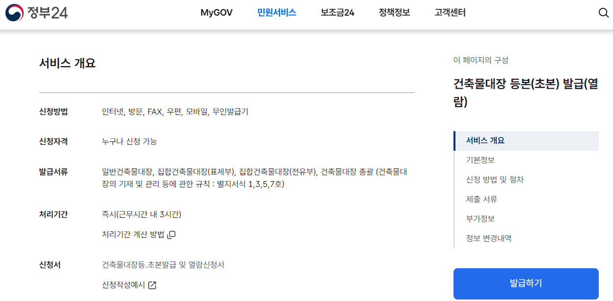 - 발급 신청하기 : 검색 결과에서 '건축물대장 발급'을 선택하고, 필요한 정보를 입력한 후 신청 버튼을 클릭합니다.