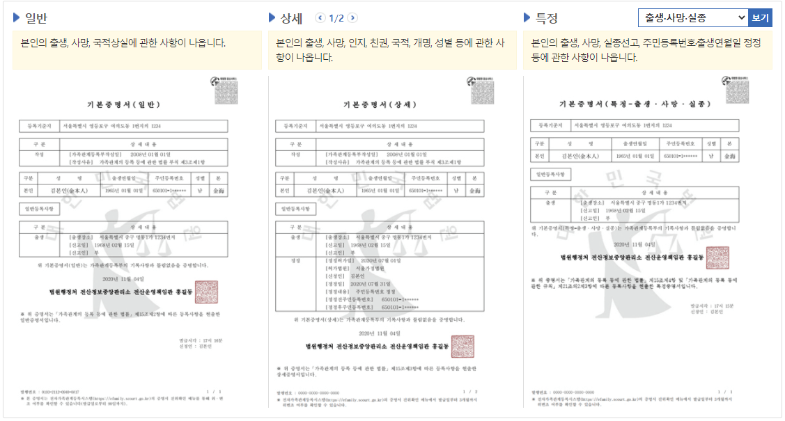 - 기본증명서는 결혼, 이혼, 상속 등 법적 절차에서 필요합니다.