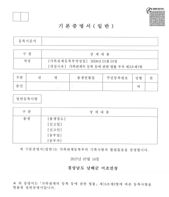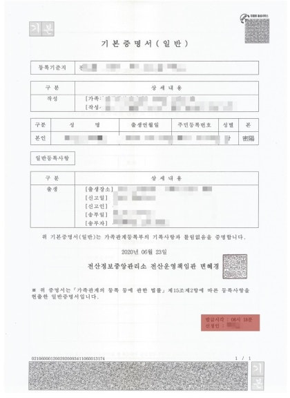 기본증명서는 개인의 출생, 사망, 혼인 등의 정보를 포함한 공식 문서입니다. 이 문서는 개인의 신원 확인을 위해 사용되며, 법적 효력을 가지고 있습니다. 기본증명서는 주로 가족관계등록부에 기초하여 발급되며, 개인의 신상 정보를 정확하게 기록하고 있습니다.