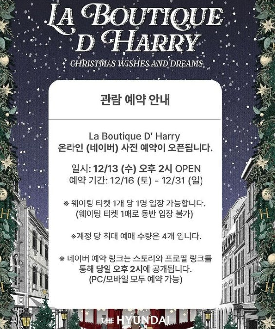 더 현대 서울의 크리스마스 예약은 매년 많은 인파로 인해 사전 예약이 필수입니다. 2024년의 경우, 예약은 12월 13일 오후 2시에 시작되며, 예약 기간은 12월 16일부터 12월 31일까지입니다. 예약은 온라인으로 진행되며, 한 계정당 최대 4명까지 예약할 수 있습니다. 예약 링크는 예약 시작일에 공개되니, 미리 체크해 두는 것이 좋습니다.