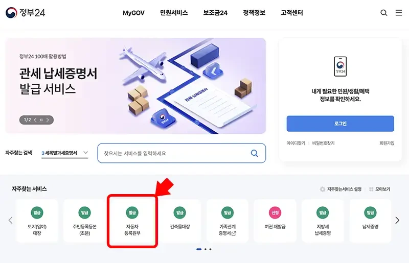 먼저, 정부24 웹사이트에 접속해요. 사이트에 들어가면 다양한 서비스가 보이는데, 그 중 "자동차 등록원부" 서비스를 찾아서 클릭해 주세요.