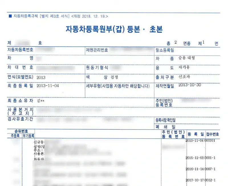 자동차등록원부(감) 등록 - 초본 문서 예시