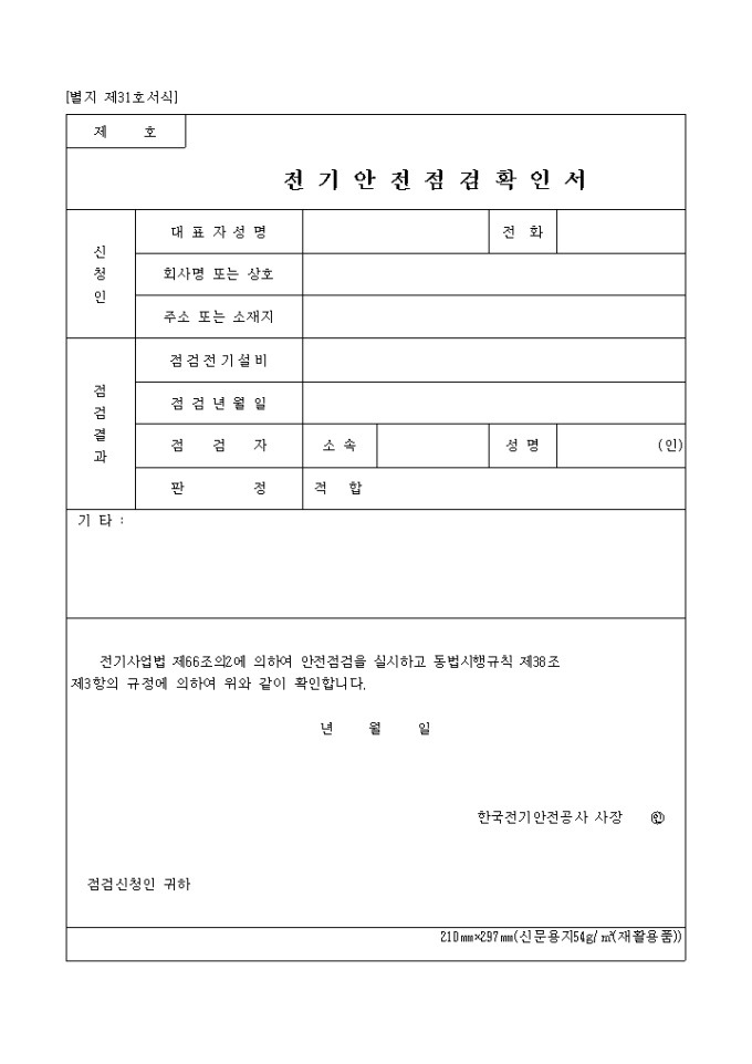 - 전기안전점검확인서가 없으면 전기설비의 사용이 제한될 수 있으며, 법적 책임이 따를 수 있습니다.