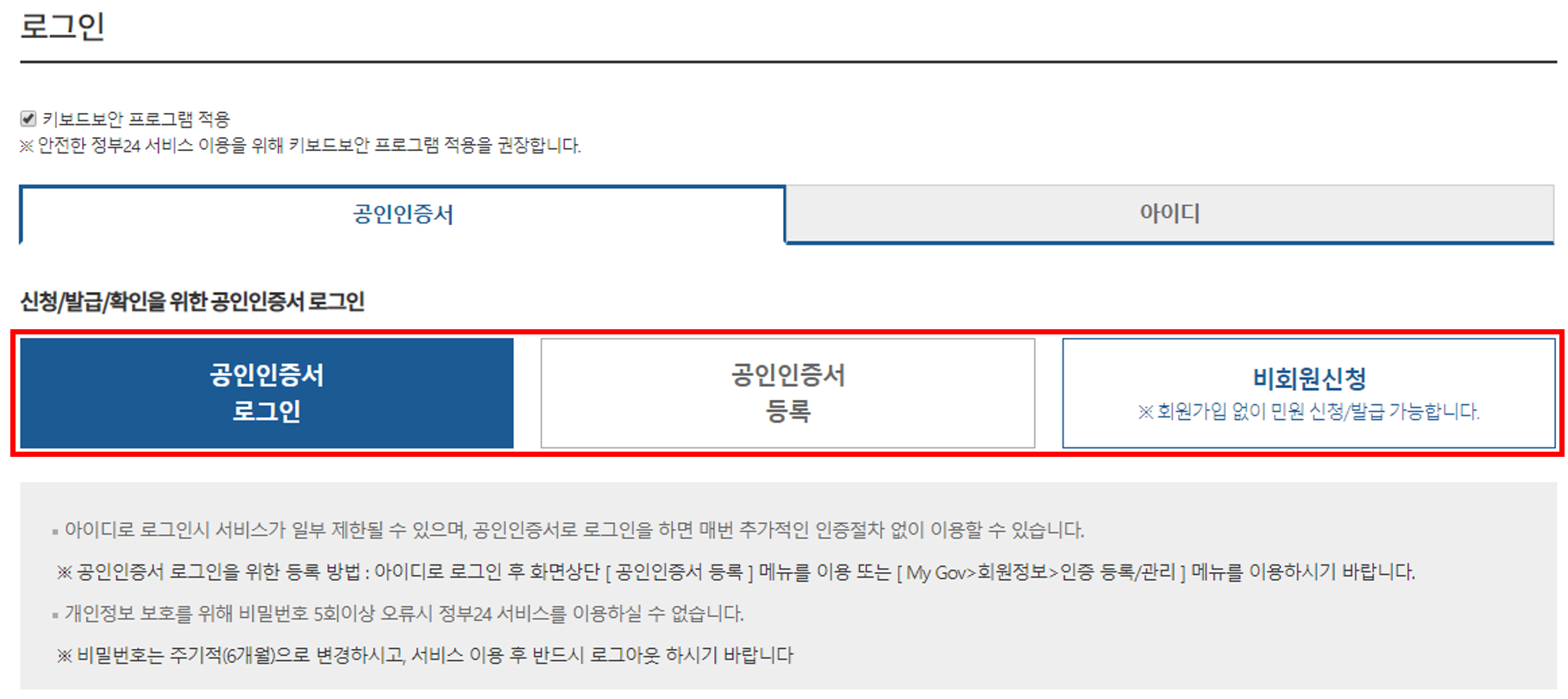 - 신분 인증 : 공인인증서 또는 본인 인증을 통해 신분을 확인합니다.