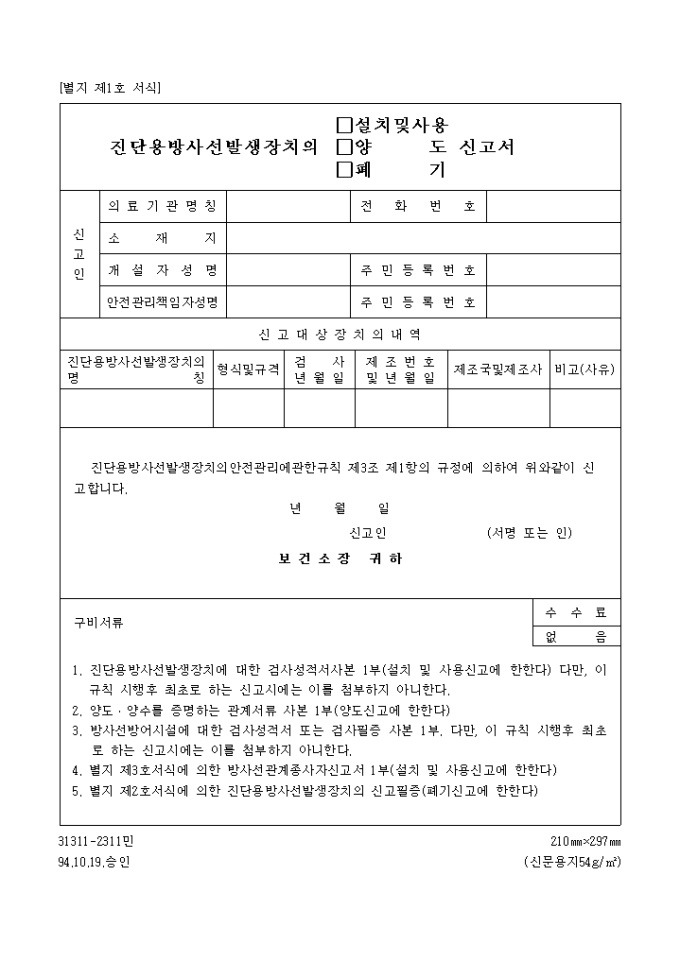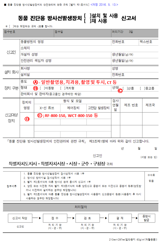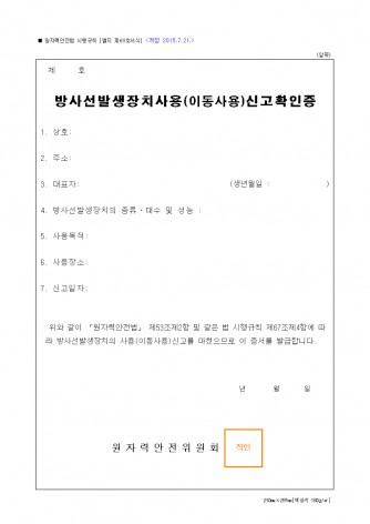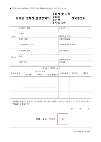 - 신청서 : 진단용 방사선 발생 장치 사용 신고증명서 신청서 (별지서식 3)